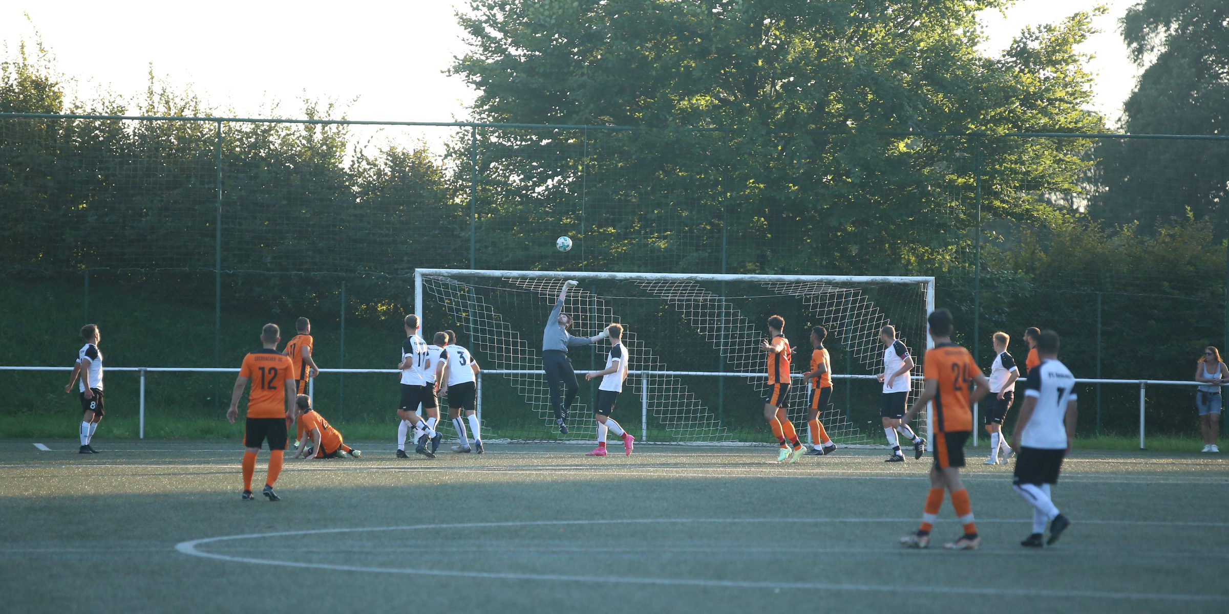 In einem größtenteils recht einseitigen Spiel musste das Meckesheim-Mönchzeller Team heute gegen einen läuferisch und spielerisch überlegenen Gegner in der 58. Minute das Tor des Tages verkraften. Von Beginn weg war das Gästeteam die aktivere Mannschaft, der FC hielt defensiv ordentlich dagegen. Die womöglich einzige hundertprozentige Chance des FC Germania hatte man bereits in der ersten Viertelstunde, als Jonas Pflaugner über die linke Außenseite bis zum Fünfer lief und dann quer durch den Strafraum legte. Emanuel Karamanitakis kam von hinten angelaufen, hätte das Leder einschieben können, verzog aber deutlich, so dass der Ball über die Querlatte schoss. Der Unparteiische Nicolas Heuss hatte hierbei auf Abseits entschieden, die einzige fragliche Entscheidung des Referees, der ansonsten eine tadellose Spielleitung in einem zwar einseitigen, aber nicht einfach zu leitenden Spiel an den Tag legte. Da unser Stürmer den Ball aber ohnehin übers Tor jagte, war der Aufreger auch nicht so groß. Ansonsten spielte überwiegend Eberbach und Lukas Bernauer hatte im FC Tor alle Hände voll zu tun, um gemeinsam mit dem restlichen Team größeren Schaden abzuwenden. Bis zur Halbzeitpause gelang dies auch. Vorne hatte unser Team noch ein paar Halbchancen, zu mehr reichte es nicht, da der Gegner unserem FC offensiv kaum Raum zur Entfaltung ließ.