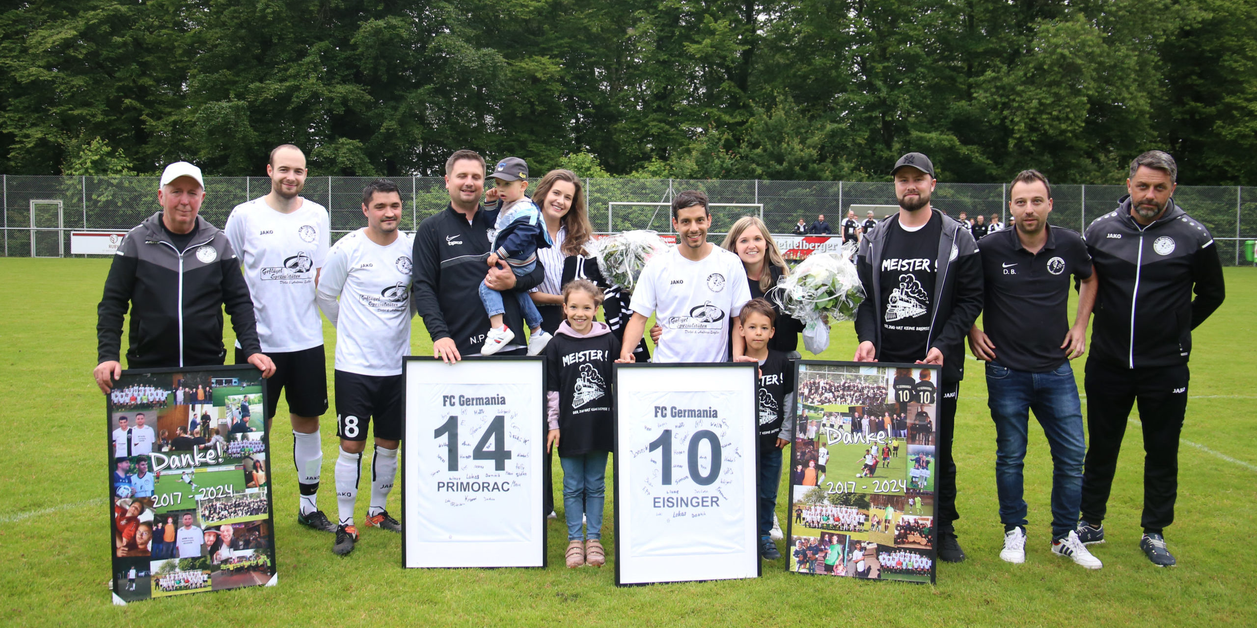 Beim letzten Punkt der Ehrung und Verabschiedung sah man den Verantwortlichen doch die ein oder andere Träne des Abschieds an. So trennen sich nach sieben Jahren und zwei Meisterschaften zum Ende dieser Runde die Wege unseres Vereins sowie des Trainerteams Nik Primorac und Samuel Eisinger. Beide waren zur Spielzeit 2017/2018 zum FC gewechselt und schlossen die Premierensaison nach einem arg unglücklichen Saisonfinish auf dem zweiten Platz ab. Bei der nachfolgenden Relegation unterlag man dem in allen Belangen überlegenen Gegner erst im Elfmeterschießen. Noch in der Nacht der Niederlage verkündete Primorac im Gasthaus Zum Löwen in Meckesheim den erneuten Anlauf in der Folgesaison zum Aufstieg, welcher mit eindrucksvollen 72 Punkten und 145 zu 25 Toren gelang. Nach fünf Jahren in der Kreisklasse B ist unser FC nun zum Ende dieser Saison in die A-Klasse Heidelberg aufgestiegen. Maßgeblichen Einfluss hatte auf dem Platz in de Rückrunde Samuel Eisinger, der sich für keine Zweikampf zu schade war, immer dahin ging „wo es wehtut“, wichtige Treffer einleitete oder selbst vollstreckte. Großen Einfluss hatte auch Spielertrainer Nik Primorac, der in der Hinrunde noch selbst am Ball, in Neuenheim den FC auf die Siegerstraße brachte, bevor ihn eine sehr unglückliche und langwierige Verletzung komplett aus dem Spiel nahm. Doch er kämpfte sich zurück, trainierte und motivierte sein Team stets bis unter die Haarspitzen und zeigte uns heute in seiner letzten Partie für unseren Germania seinen ausgeprägten Torriecher. Beiden Angesprochenen gebührt unser großer Dank für sieben wundervolle Jahre, zwei Meisterschaften und Spieler wie Verein brachten dies – so kann man es nach Studium der zugehörigen Bilder sicherlich festhalten – heute in jeglicher Weise zum Ausdruck. Deshalb schließen wir uns den Worten unserer Fans an und sagen: „Danke für alles – Samu und Nik“